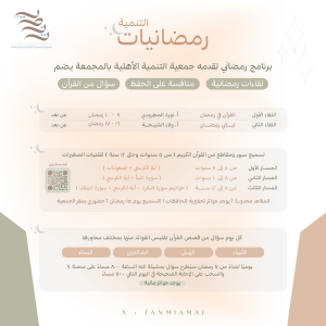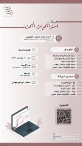 تم نشره بتاريخ 16 سبتمبر، 2024 بواسطة mm1318ff تطوير الذات: مع أ. أشواق الرشيدي استراتيجيات البحث: مع د. اسماء القطيم رمضانيات : مع أ. نورة المطرودي و أ. ولاء الشيحة استراتيجيات تصميم الجرافيك ببرنامج كانفا: مع أ. يحيى الحمزي صناعة الطفل الواثق: مع د. فوزية عقيلي